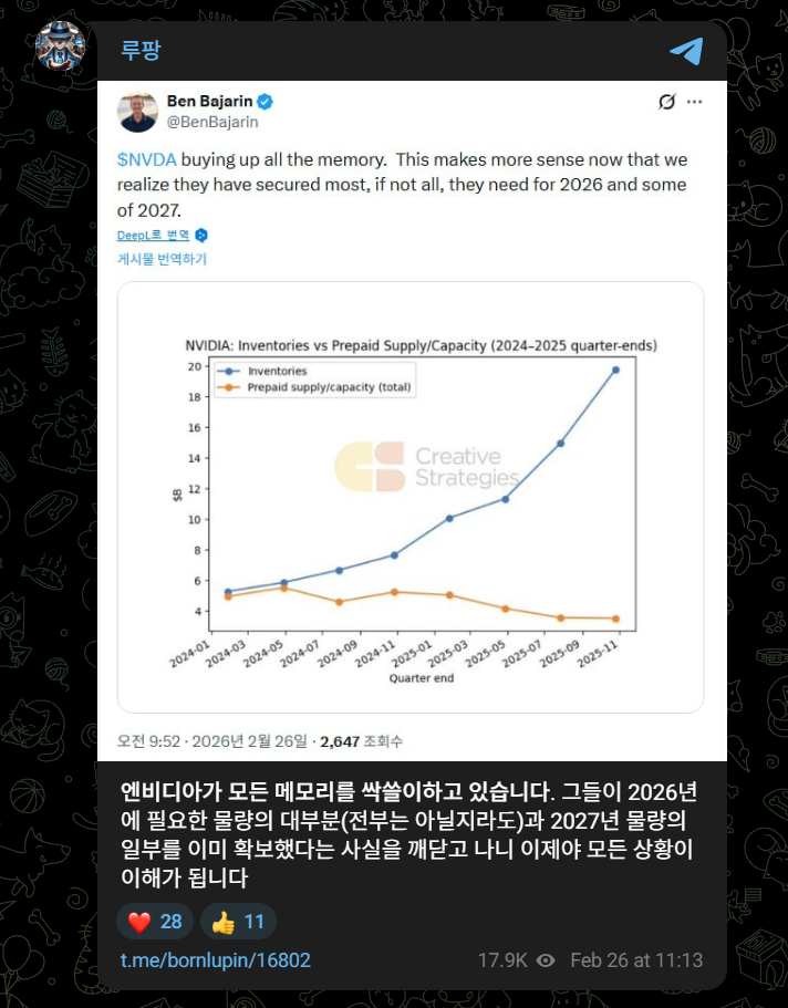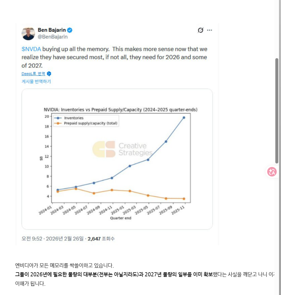 러프하게 보면 아직 27년 장기계약액은 완전히 반영됐다고 보기 어렵습니다. 삼성전자와도 LTA를 맺고 있으니 엔비디아의 구매확약은 3배 급증했음에도 더 올라갈 여지가 크다고 봐야 겠습니다.