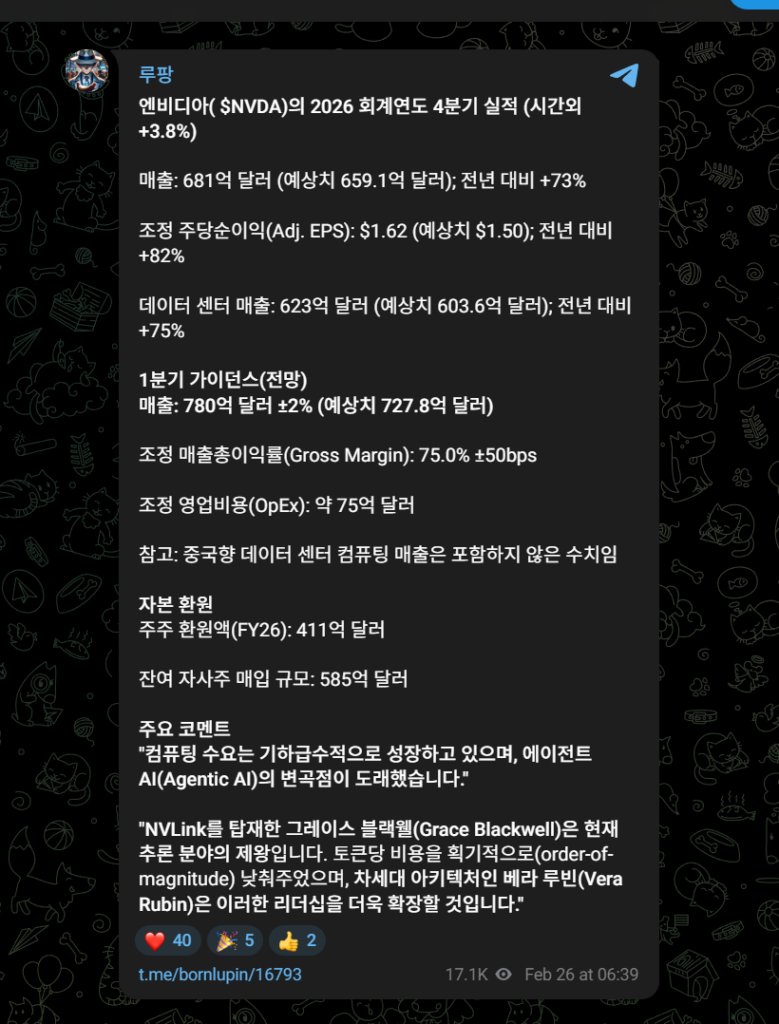 다만 시장은 항상 묻습니다: “Vera Rubin이 실제로 언제/얼마나/어떤 수율로 나오나?” → 이 부분은 향후 분기에서 공급(throughput)과 제품 믹스로 검증됩니다.