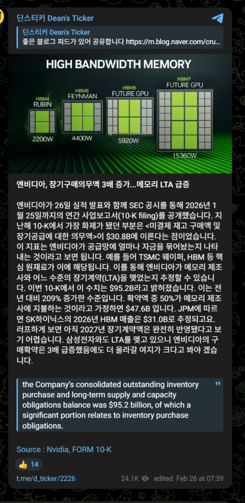 다만, $95.2B는 강력한 확신의 증거인 동시에, 매크로/규제/수요 둔화 시 리스크의 크기도 같이 커지는 구조라서, 투자에서는 (1) Blackwell/GB200~GB300 공급 정상화 (2) HBM/LTA 물량의 실제 귀속(하이닉스/삼성/기타) (3) 네트워킹 성장의 지속성을 다음 분기까지 체크하는 게 핵심입니다.