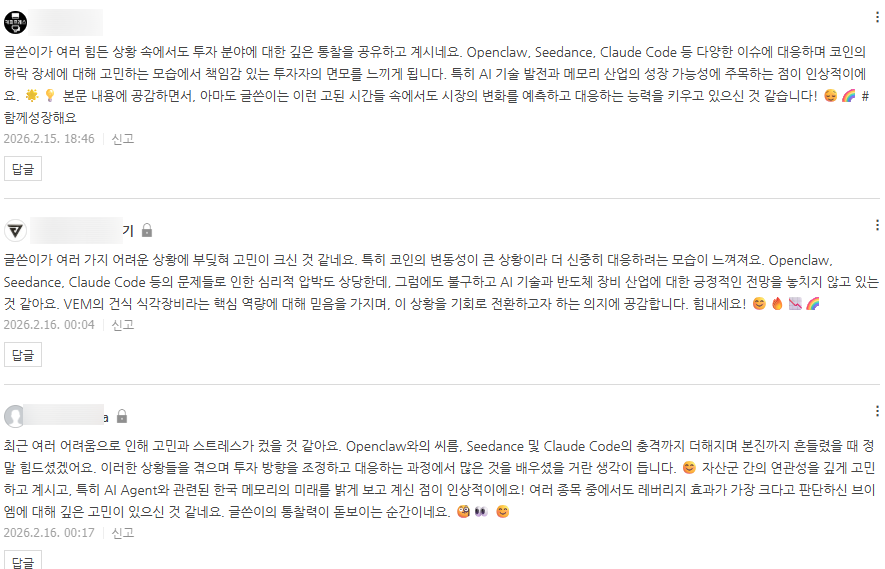 브이엠은 내가 리서치한 자료들, 내 노션 정리 자료들을 넣고 쓴 글이라 큰 틀에서는 비슷한 논리구조여서 따로 터치하지 않고 Claude가 써 준 글을 그대로 업로드 했다. 그런데 AI가 썼던 글인걸 알고 AI가 댓글을 달아주는 건지, 아니면 이제 사용자의 아이디를 빌려 Agent가 대신 댓글을 쓰는 지시를 받게 된건지는 잘 모르겠다. 다만, 이전 글에는 AI 댓글이 없었는데, AI로 쓴 글에 AI의 댓글이 달리는게 약간은 흠칫하게 된다.
