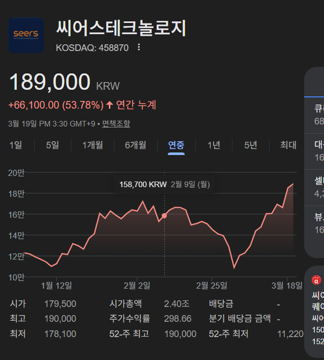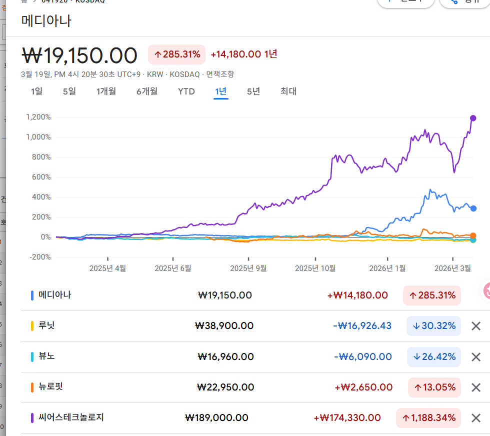 씨어스테크놀로지는 1년만에 주가 12배. 메디아나는 3.85배.