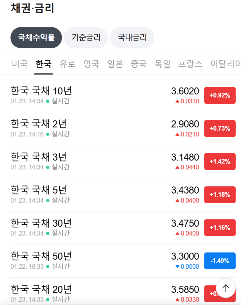 한국 국채수익률 10년 3.6% 5년 3.4% 20년 3.47% 220년 3.58% 대비 낮다.